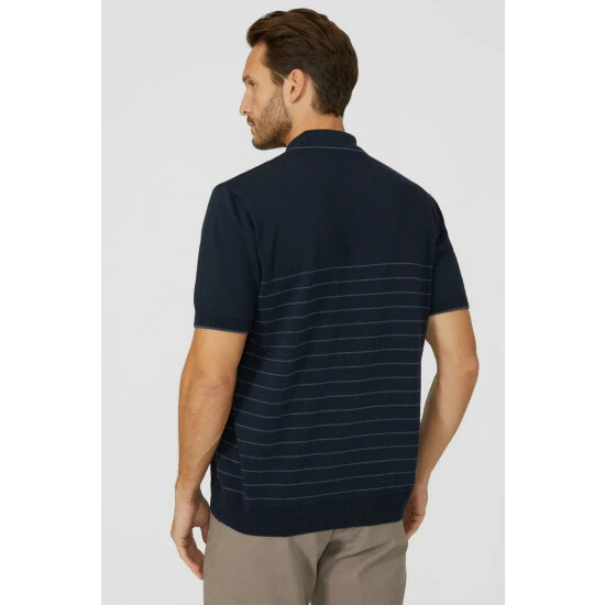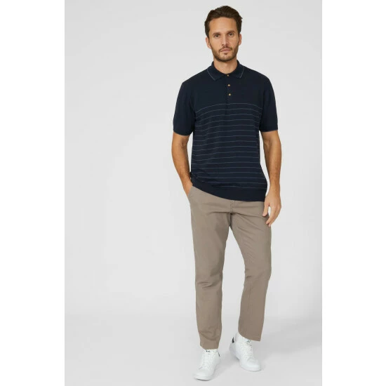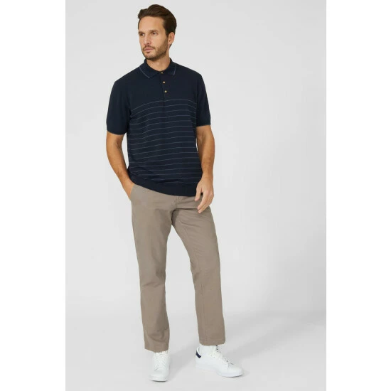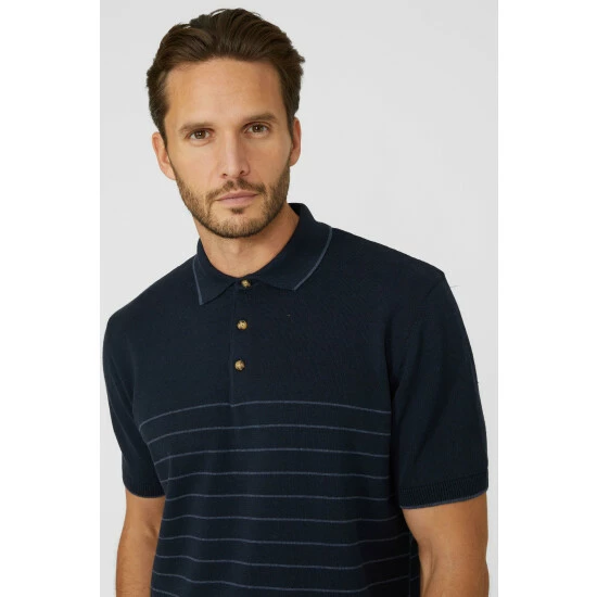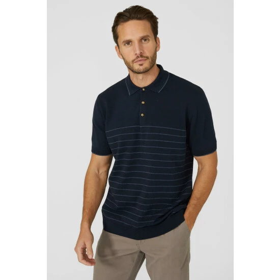 Placement Striped Knitted Polo from Maine. Smart in style and expertly crafted from premium fabrics, look to this striped knitted polo top for men. Featuring short-cut sleeves, a smart collar neckline, front button detailing, horizontal strips and a tailored cut finish.