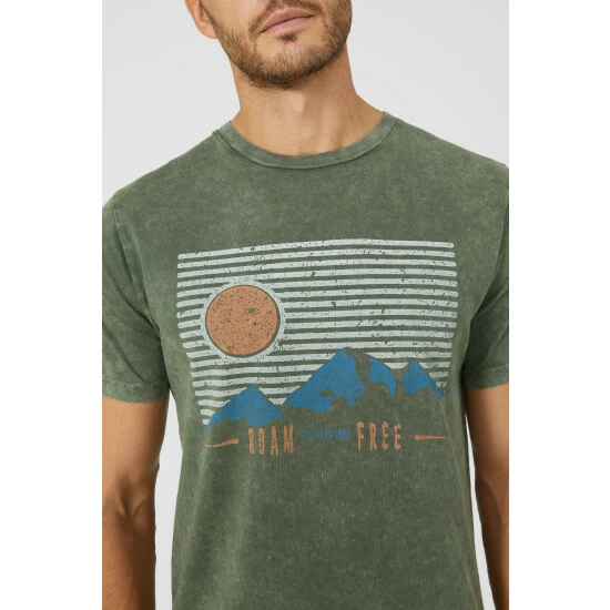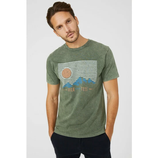 Acid Wash Roam Free Print Tee from Mantaray. Relaxed in style and crafted from soft quality fabrics, look to this trending print tee for men. Boasting short-cut sleeves, a circular neckline, a cool print tee logo and a tailored cut fit for the optimal fit. Made from 100% Cotton. Wash at 40. Model wears a Size M.