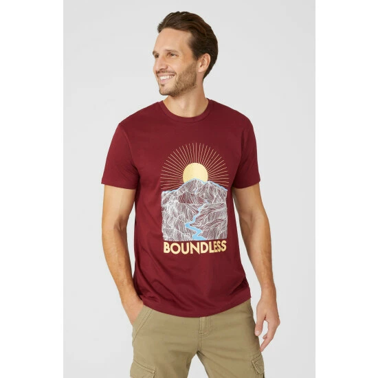 Boundless Printed Tee from Mantaray. Super comfortable and easy to style with many outfits, revamp your wardrobe with this quality men’s tee. Boasting short-cut sleeves, a comfortable neckline, a cool ‘Boundless’ print logo and a tailored cut finish for the perfect fit. Made from 100% Cotton. Wash at 30. Model wears Size M.