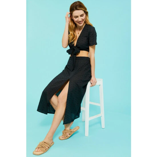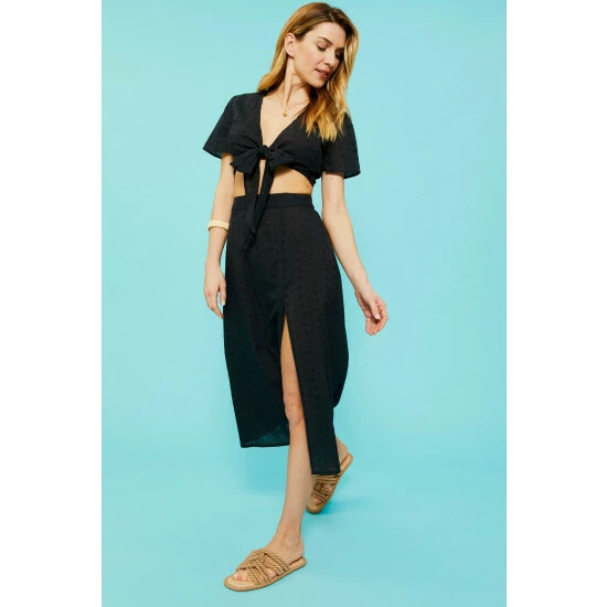 Broderie wrap front top from Mantaray. Exuding a carefree, ethereal vibe this top is sunshine, sandy beaches, sunsets and seashells all wrapped up in a broderie fabric. Featuring a plunging V neck, a self-tie wrap and half sleeves. Complete the look with matching skirt. Other colours available.