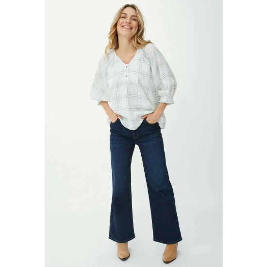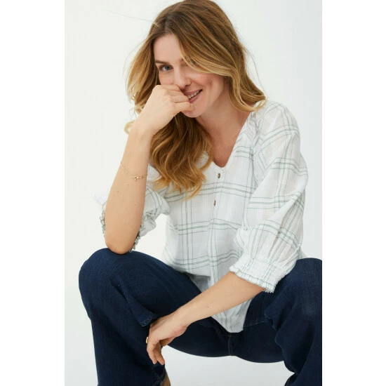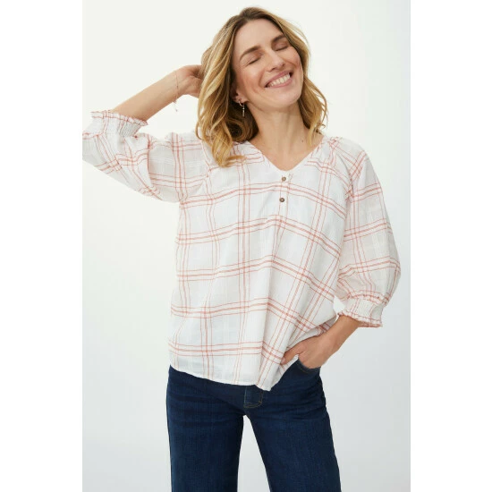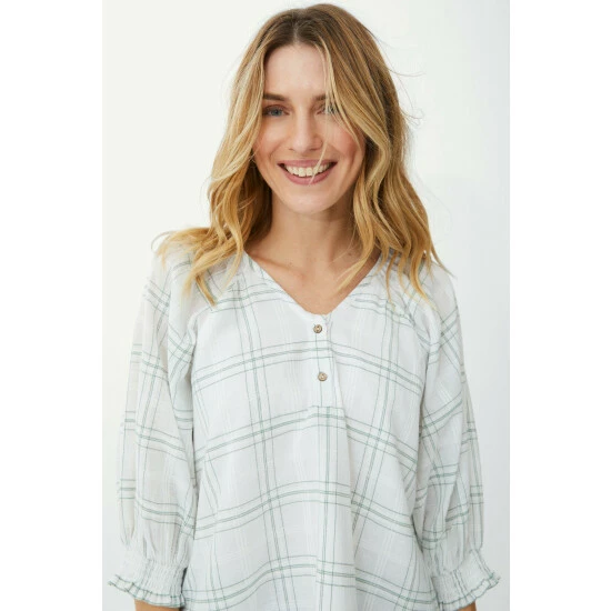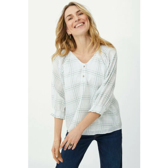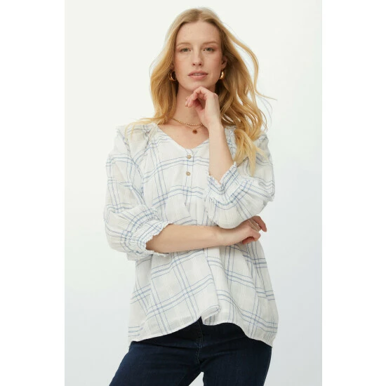 Check dobby top from Mantaray. In a versatile check pattern, this relaxed-fit top is the perfect mix of traditional and modern. Featuring a V neck, placket buttons and ruched cuffed sleeves, this style is perfect for work and weekends alike. Other colours available.
