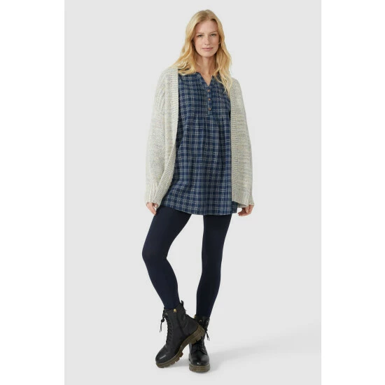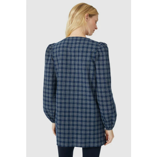 Notched neck check tunic from Mantaray. In a versatile check pattern, this relaxed tunic top is the perfect mix of traditional and modern. Finishing below the hips for a flattering fit, it features a notched neck, pretty pin-tucked front placket with contrast buttons and long bishop sleeves. This style is perfect for work and weekends alike.