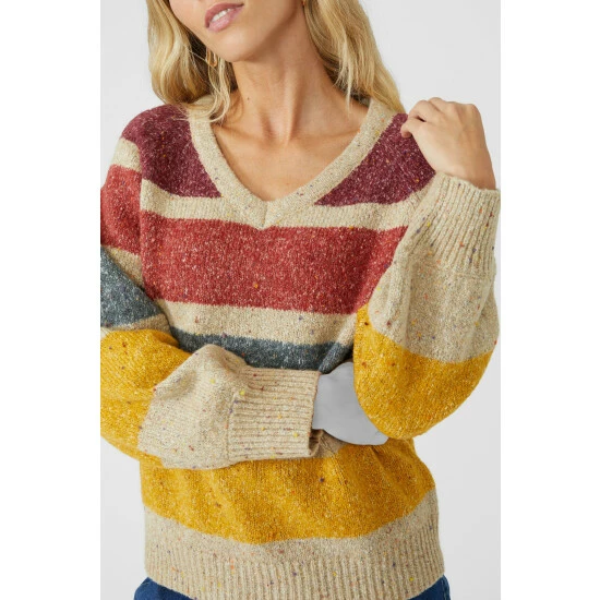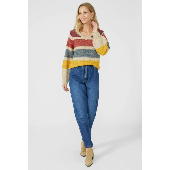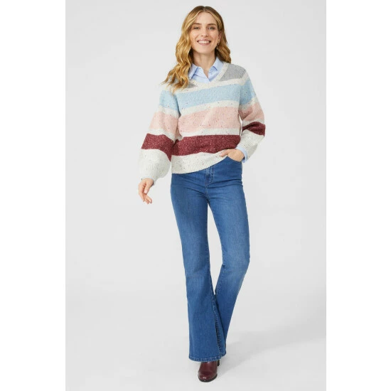 Chunky Nep Stripe V Neck Jumper from Mantaray. Inject eye-catching knitwear styles into your seasonal wardrobe and select this beautiful V neck jumper. Boasting long soft sleeves with stretch cuffs, a comfortable V neckline, and a tailored cut finish for the perfect warm fit. Crafted from 57% Acrylic, 24% Polyester, 19% Cotton, 1% Elastane. Wash at 30. Model wears a Size 10.