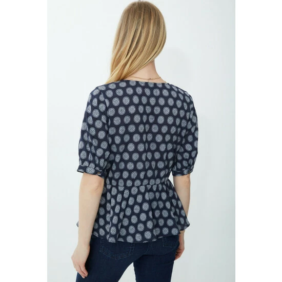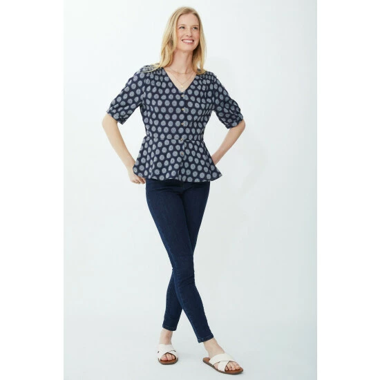 Jacquard print button through peplum top from Mataray. Perfect for making an impact on warmer days. Designed with a peplum cut, this top features a jacquard print all over, ruching on the shoulders, a V neck, placket buttons and 3/4 puffed sleeves.