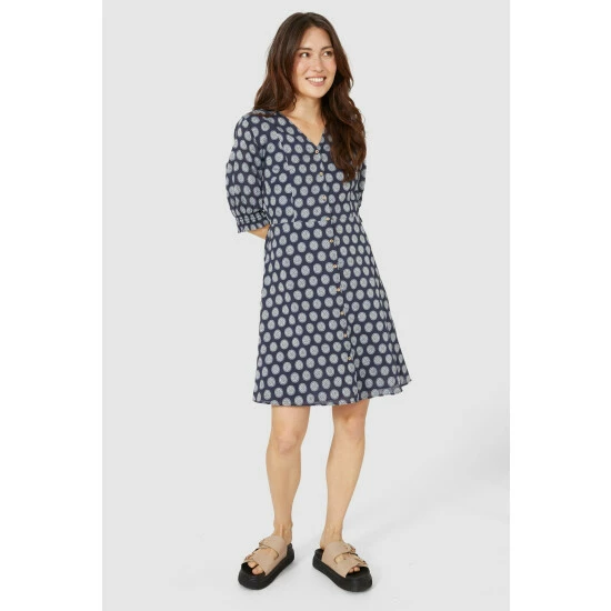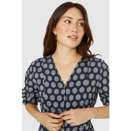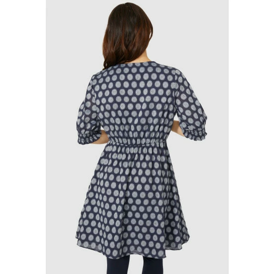 Circle jacquard notch neck tunic dress from Mantaray. Perfect for making an impact on warmer days. This dress has been designed with a stunning jacquard print and features a V neck, placket buttons and 3/4 sleeves with shirred hems.