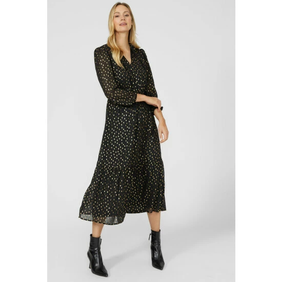Clipped Detail Midi Dress from Mantaray. Timeless in style and forever elegant, look to this beautiful women’s clipped midi dress. Boasting long fitted sleeves with cuff detailing, a V cut neckline, a beautifully cinched waist to enhance curves and an all-over gold print finish. Made from 100% Polyester. Wash at 30. Model wears a Size 10.