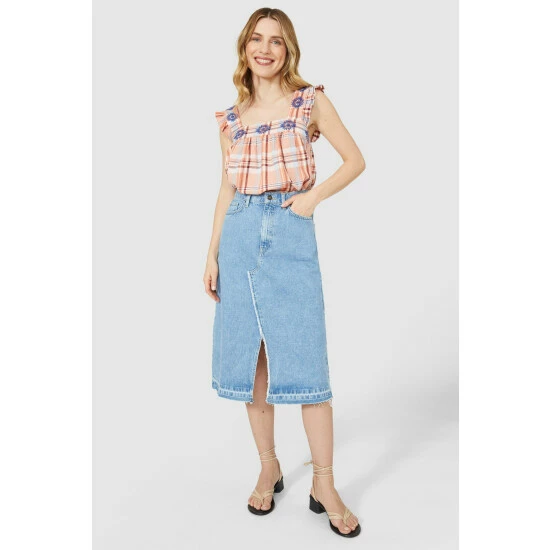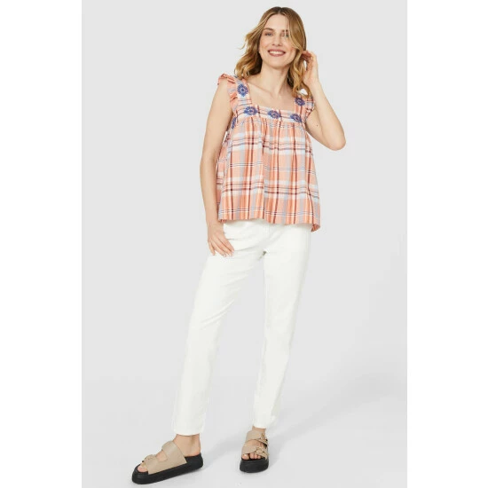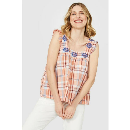 Embroidered Check Square Neck Cami from Mantaray. Opt for timeless elegance and update your look with this beautiful women’s top. Boasting an embroidered floral print neckline with square neck detailing, frill-shaped shoulder straps, and a relaxed and comfortable fit. Style with white trousers or a denim skirt and strappy sandals. Crafted from 100% Cotton. Wash at 30. Model wears a size 10.