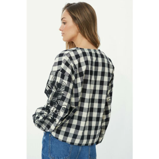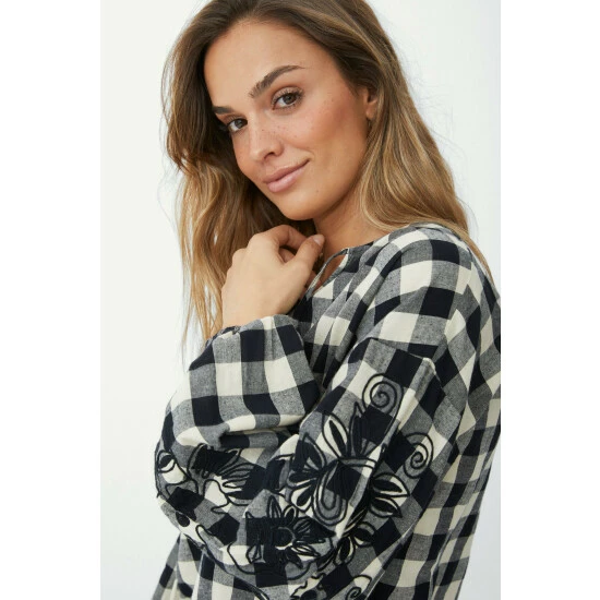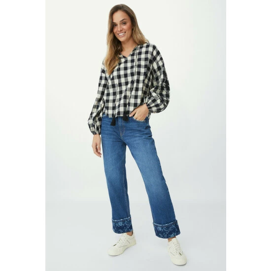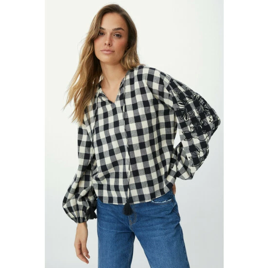 Embroidered check sleeve shirt from Mantaray. Made from a chic check print fabric, this top is as comfortable as it is pretty. The loose silhouette makes this an easy and flattering wear, while the statement sleeve and tassels add that little something extra. Other colours also available.