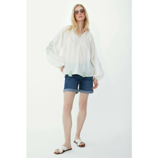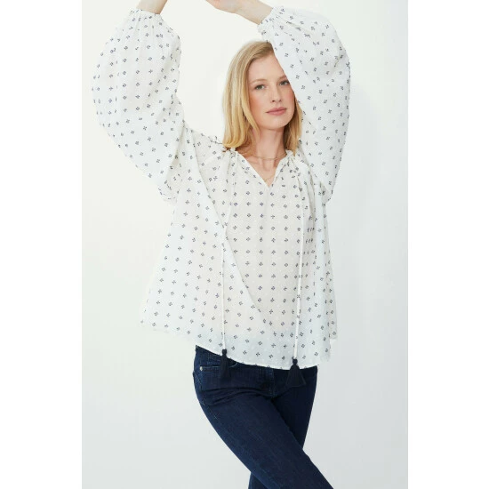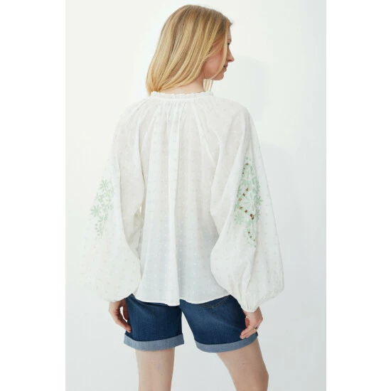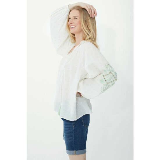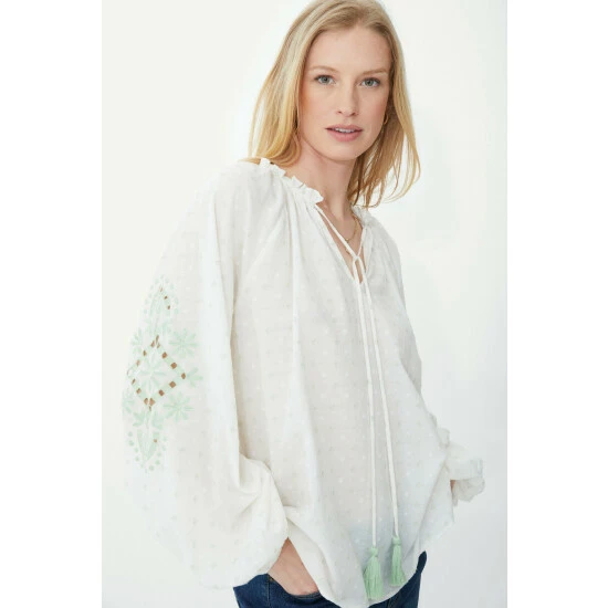 Embroidered sleeve spot dobby top from Mantaray. Designed in a true bohemian spirit, this top has been crafted from a dobby fabric with a frilled collar, V neck with tassels, flower and cut embroidery on the sleeves with elasticated hems. Other colours available.