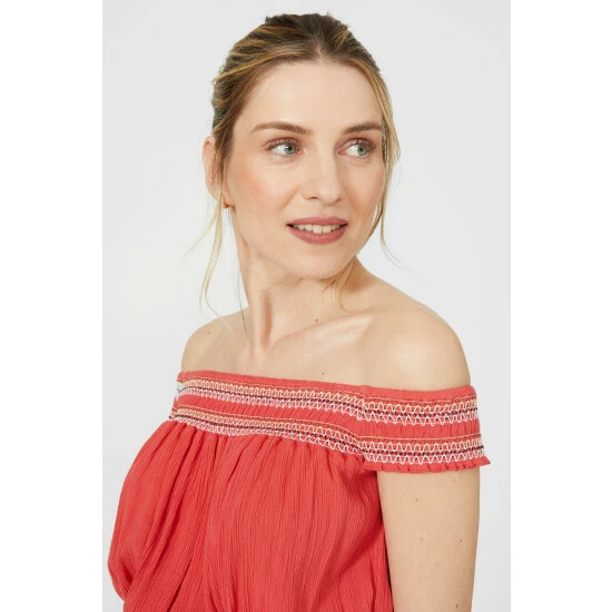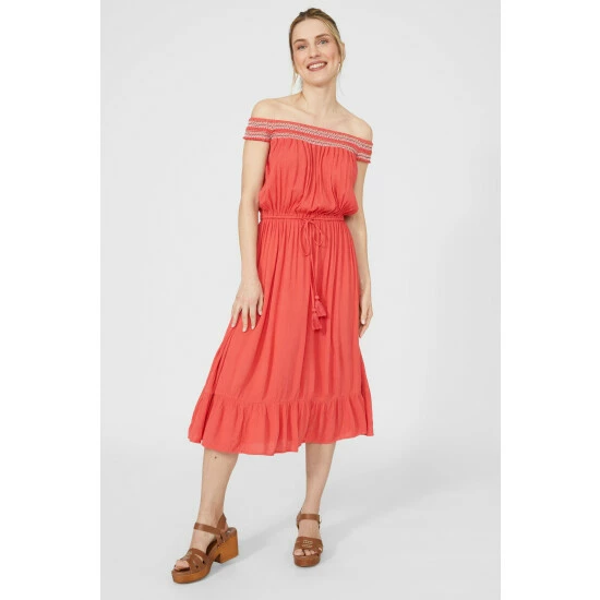 Embroidered Smock Bardot Crepe Midi Dress from Mantaray. Opt for bold colours and elegant silhouettes this season and discover this must-have women’s midi dress. Boasting an elegant, embroidered design, smock detailing, a front tassel tie and a flattering shape midi dress finish. Complete the look with chunky strap sandals and statement jewellery. Crafted from 100% Viscose. Wash at 40. Model wears a size 10.
