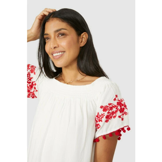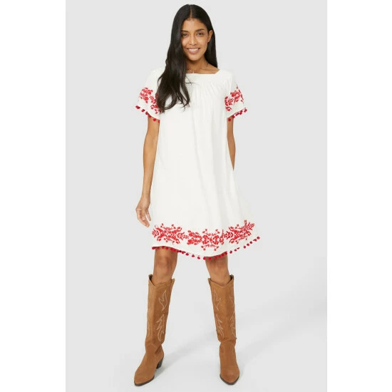 Embroidered Trim Scoop Neck Dress from Mantaray. Inject bohemian-inspired dress styles into your wardrobe this season and select this embroidered trim scoop neck dress for women. Featuring short-cut sleeves with tassel embellishments, a scoop cut neckline and a beautifully embroidered dress finish. Style with statement knee-high boots. Made from 100% Viscose. Wash at 40. Model wears a Size 10.