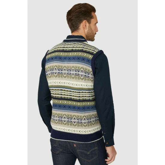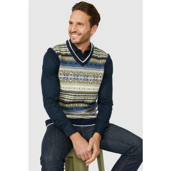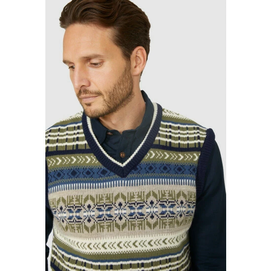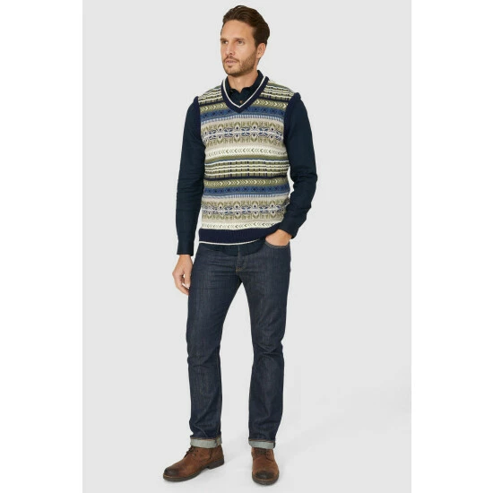 Fairisle Tank Jumper from Mantaray. Crafted from super-soft fabrics and smart in design, look to this fairisle tank jumper this season. Boasting sleeves arms, a V cut neckline, fairisle print detailing and a tailored cut finish for the perfect warm fit. Made from 100% Acrylic. Wash 40. Model wears a Size M.