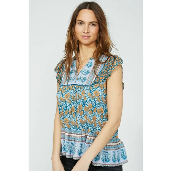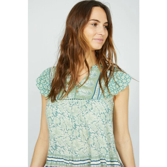Floral leaf mix and match notch crepe top from Mantaray. Designed in a true bohemian spirit, this top features a stunning mix of prints, a notch neck, placket buttons a flare hem and drop sleeves. Other colours available.