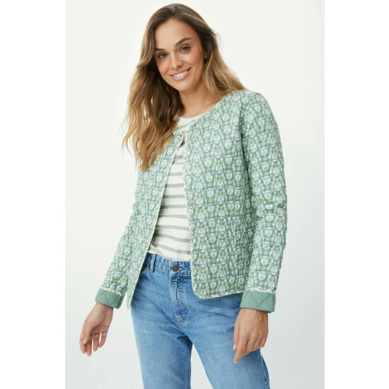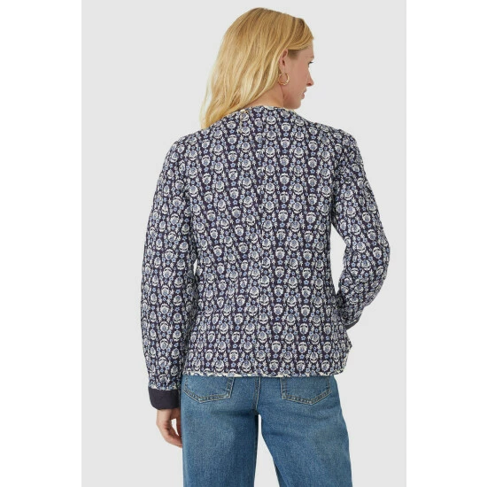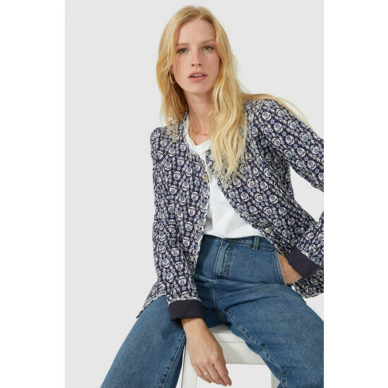 Floral Motif Print Quilted Jacket from Mantaray. Floral motif print quilted jacket. Update your spring wardrobe with this chic quilted jacket. Featuring a repeat floral pattern, front popper fastenings, two side pockets and contrast turn-back cuffs. This floral jacket is the ultimate inner and outer layer piece for seasons ahead. Team with blue jeans and heels for an elevated look. Other colours also available. Made from 100% Viscose. Wash at 40. Model wears a Size 10.