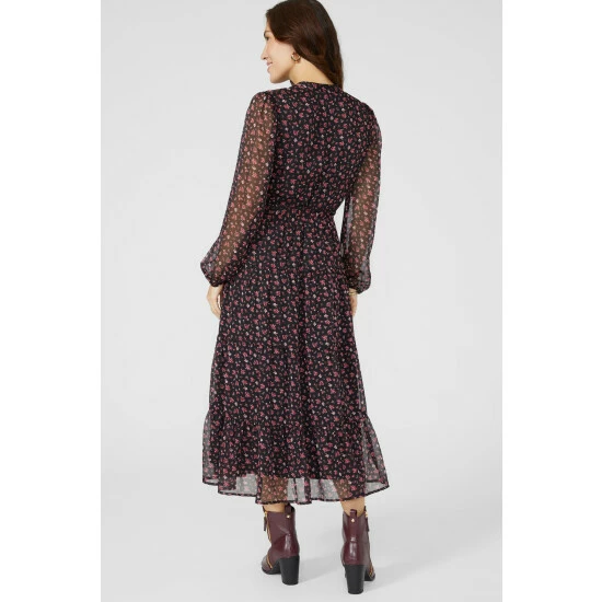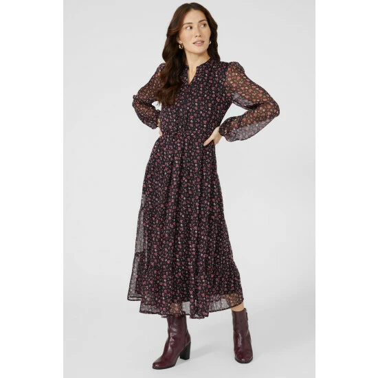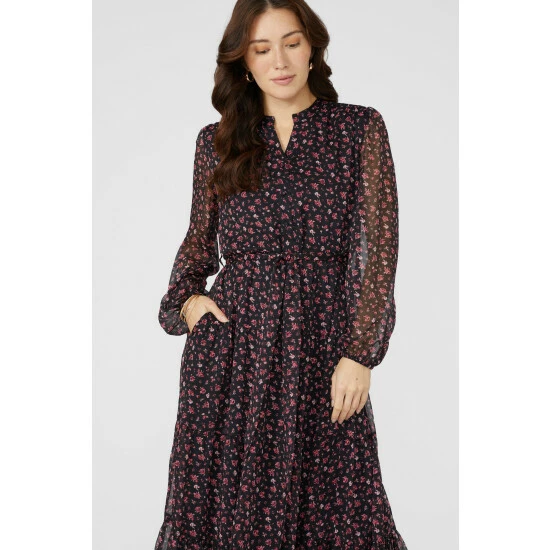 Floral Print Chiffon Notch Neck Midi Dress from Mantaray. Inject refined dress styles into your occasionwear wardrobe and select this beautiful women’s floral midi dress. Featuring long soft sleeves with elasticated cuffs, a V cut neckline, a cinched waist to enhance curves and a gorgeous floral print finish. Made from 100% Polyester. Wash at 40. Model wears a Size 10.
