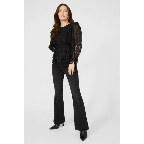 Frill Lace Top from Mantaray. Modify the way you dress this season and opt for this feminine frill lace top. Boasting long sleeves with frill detailing, a comfortable neckline, a cinched waistline to enhance curves and a beautifully tailored cut finish. Made from 100% Polyester. Wash at 40. Model wears Size 10.