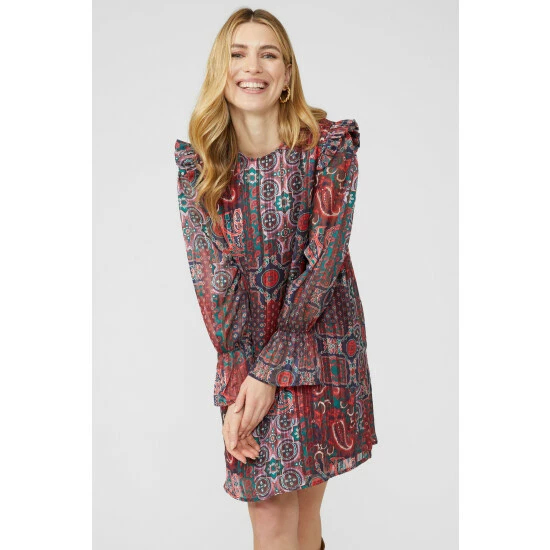 Frill Shoulder Tile Print Tunic Dress from Mantaray. Effortlessly elegant in design and crafted from luxe fabrics, look to this statement women’s tunic dress. Featuring long sleeves with elasticated frill cuffs, frill shoulder detailing, a beautiful tile print pattern and a tailored cut finish for the perfect fit. Made from Shell: 100% polyester lining: 100% Cotton. Wash at 30. Model wears a Size 10.