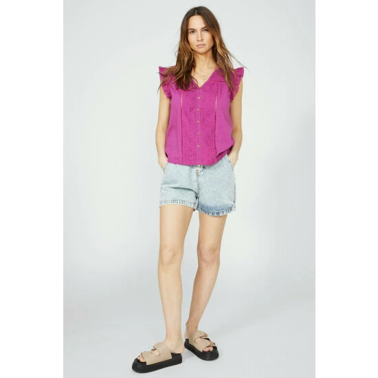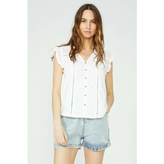 Frill Sleeve Broderie Trim Button Through Top from Mantaray. Update your look in an instant and stand out in this gorgeous women’s top. Featuring elegant frill sleeves, dainty top buttons and an ultra-feminine broderie trim finish that exudes style. Pair with your favourite jeans, best sandals and accessories for a timeless outfit.