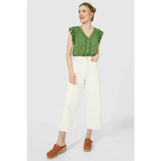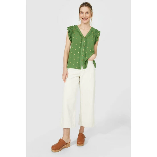 Frill Sleeve Metallic Spot Button Through Top from Mantaray. Showcase casual clothing looks beautifully with this versatile women’s top. Boasting frill sleeves with a feminine, puff sleeve design, button front detailing and a modest V neckline. Match with cargo trousers and trainers. Made from 100% Cotton. Wash at 40. Model wears a size 10.