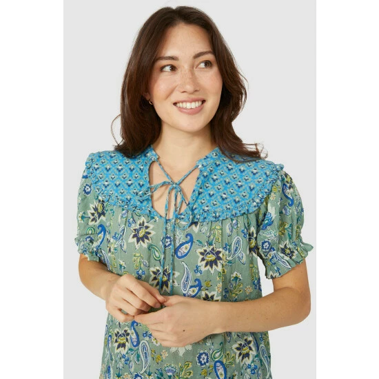 Frill yoke floral paisley print tunic from Mantaray. Designed in a true bohemian spirit, this self-tie neck top exudes nonchalance in the most stylish way possible. Adorned with a paisley print bib and frilled trims, this relaxed-fit style can be worn with denim or corduroy depending of the weather.