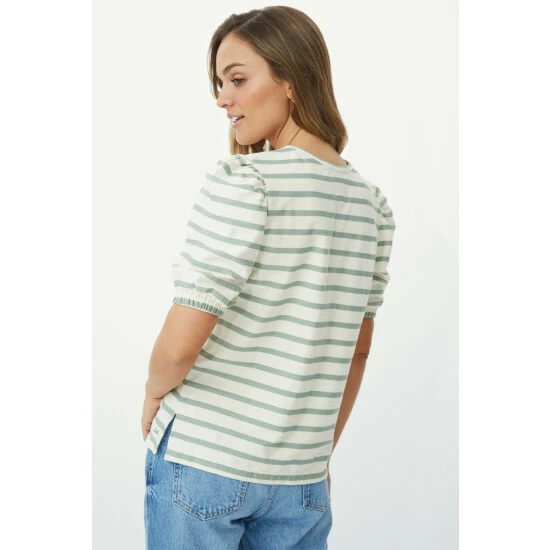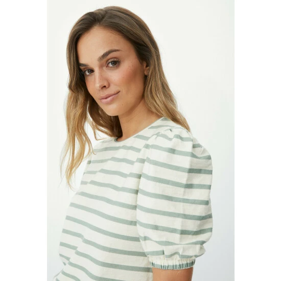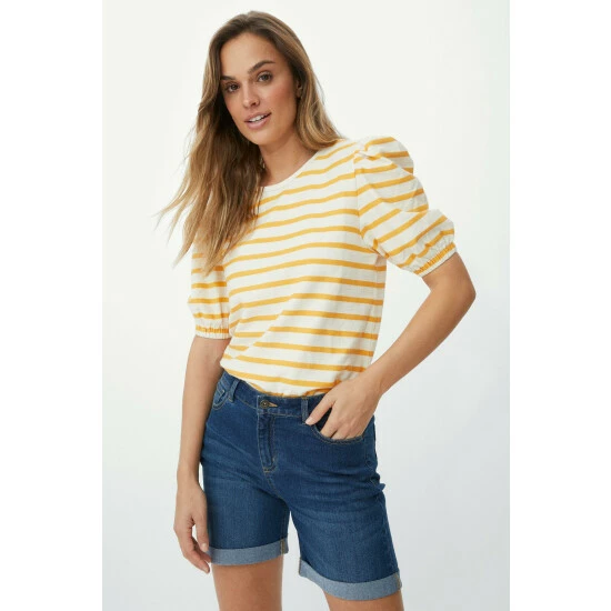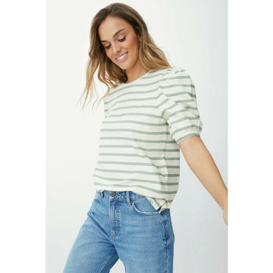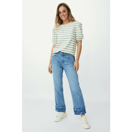 Textured stripe scoop neck top from Mantaray. Add this chic top to your wardrobe this season. Featuring a stripe print all over, a scoop neckline and puffed sleeves. Will work well with high-waisted bottoms. Other colours also available.