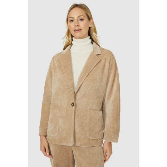 Jersey Cord Blazer from Mantaray. Inject contemporary womenswear styles into your wardrobe this season and beyond and select this jersey cord blazer jacket for women. Featuring long structured sleeves, a smart neckline, a front button, discreet pockets, and a tailored cut finish for a smart aesthetic. Made from 100% Polyester. Wash at 30. Model wears a Size 10.