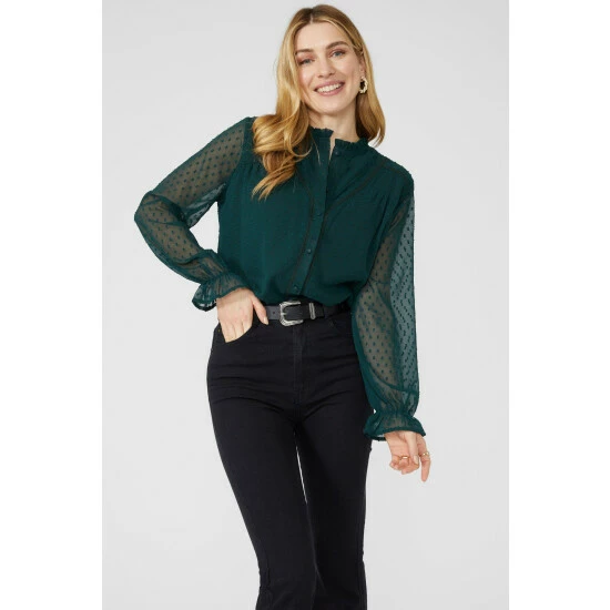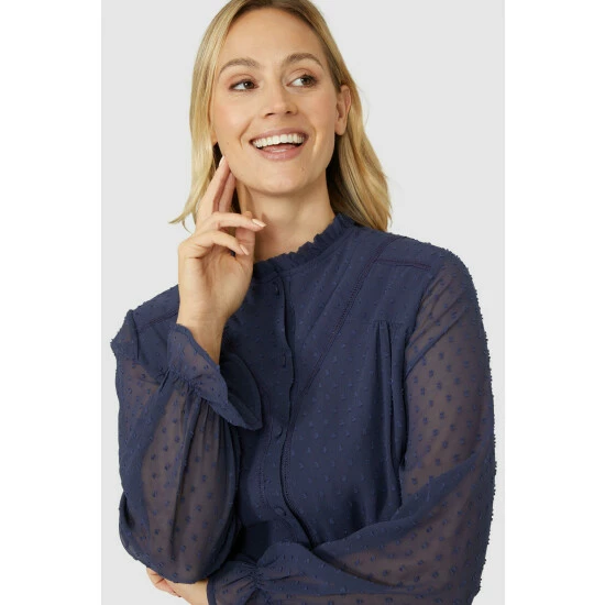Lace Trim Dobby Frill Neck Button Through Blouse from Mantaray. Modern in design and crafted from luxe fabrics, look to this lace frill neck blouse for women. Boasting beautiful lace sleeves with frill cuffs, a high cut neckline with frill embellishments, front button detailing and a tailored cut finish for the perfect fit. Coordinate with fitted jeans and smart shoes.