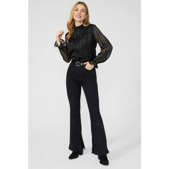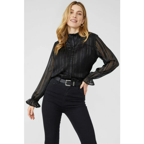 Lace Trim Metallic Frill Neck Button Through Blouse from Mantaray. Modify your occasionwear look and choose this must-have women’s frill neck blouse top. Featuring long sleeves with stretch frill cuffs, front buttons, a beautiful metallic print, lace trims and a tailored cut finish. Style with fitted jeans and smart footwear.