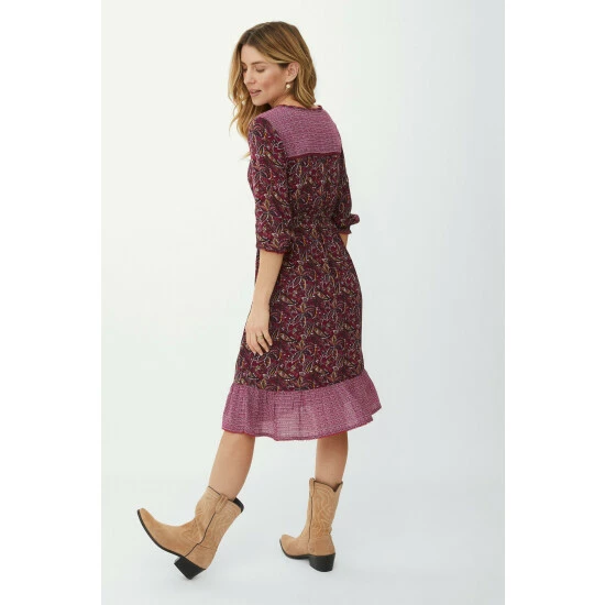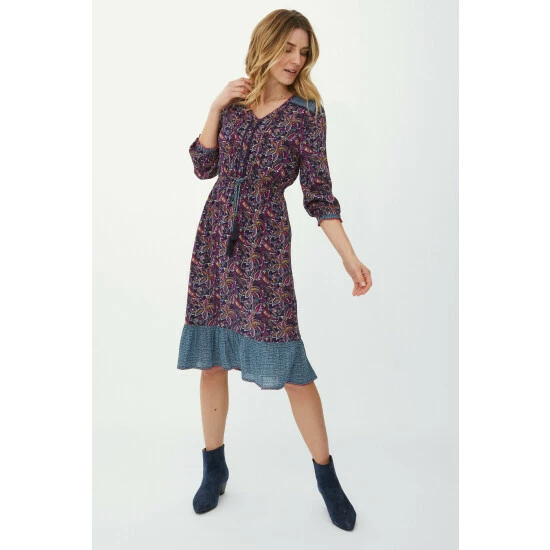 Leafy floral border print midi dress from Mantaray. In a stunning mix of prints, this dress will surely make you stand out from the crowd. With a feminine V neck, a gathered waist with a tassel drawstring, a flared hem, placket buttons and constrasting trims. Other colours available.