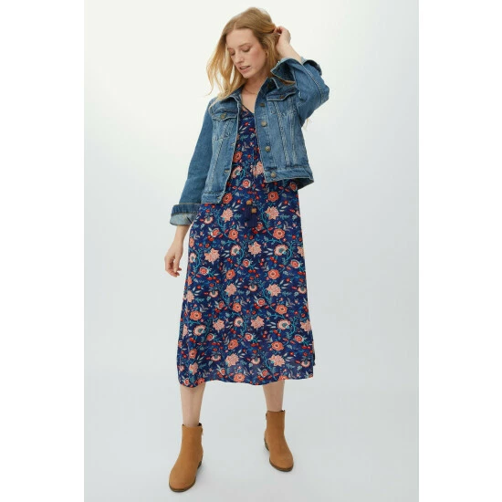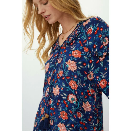 Floral and leaf print frill neck midi dress from Mantaray. Stand out from the crowd is this stunning floral and leaf dress. Designed from a crepe fabric, this dress features a beaded tassels, frills across the neckline and sleeves. Pair with boots for the ultimate boho chic look.