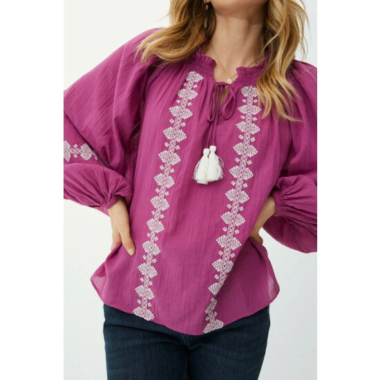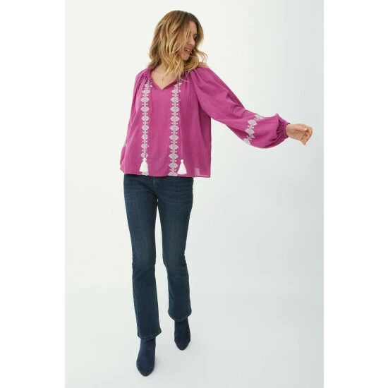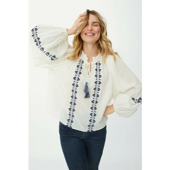 Embroidered detail tie neck top from Mantaray. Stand out from the crowd in this stunning top. Featuring thread embroidery across the front and sleeves, a self-tie frill neck with tassels and elasticated hems. Other colours available.