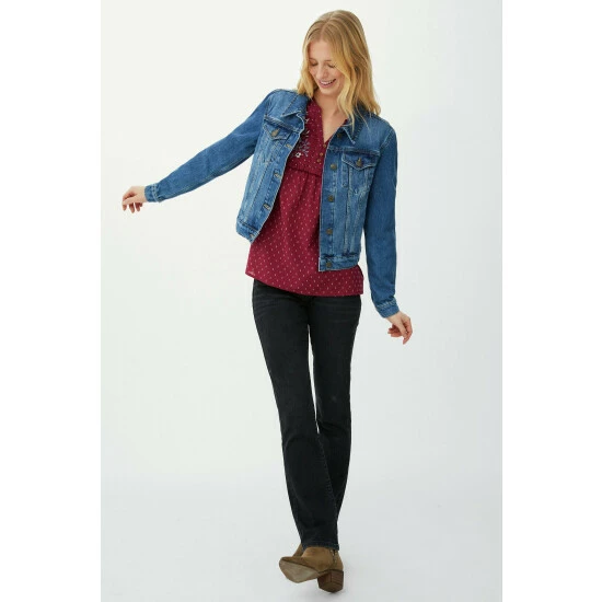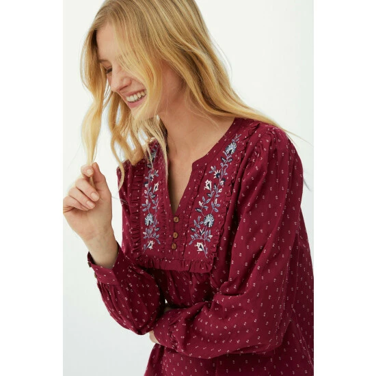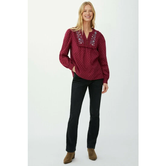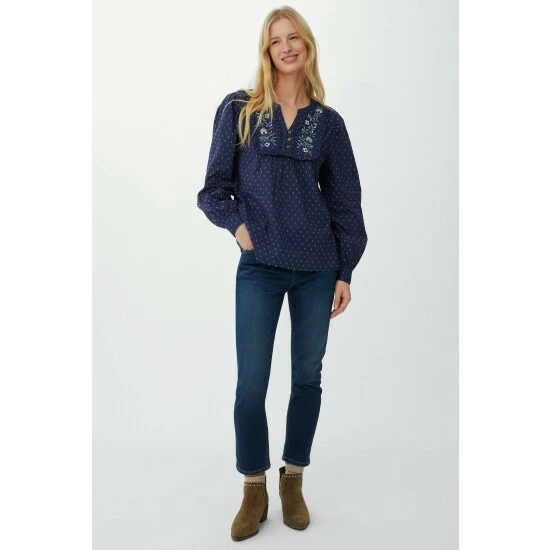Swiss dot print top from Mantaray. Perfect for making an impact on warm weather days, this long sleeve top features a swiss dot print all -over, flower embroidery and a frilled bib across the front with placket buttons. Pair it with pale denim or simple pieces to really let those prints standout.