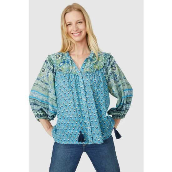 Longsleeve Frill Yoke Floral Paisley Top from Mantaray. Transform the way you dress with this elegantly designed women’s top. Featuring a beautifully bold paisley print design, oversized ruched sleeves, top buttons and a charming tassel string finish. Coordinate and style with your favourite pair of denim jeans for an effortlessly relaxed, yet chic look.