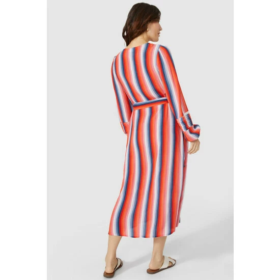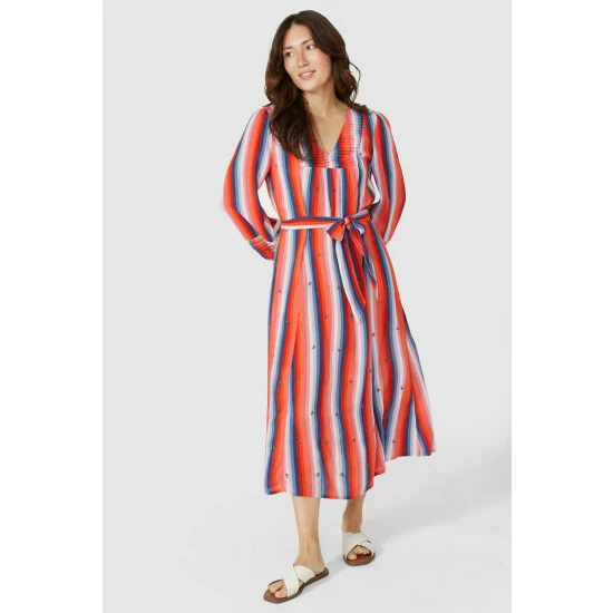 Longsleeve Stripe Pleat V Neck Midi Dress