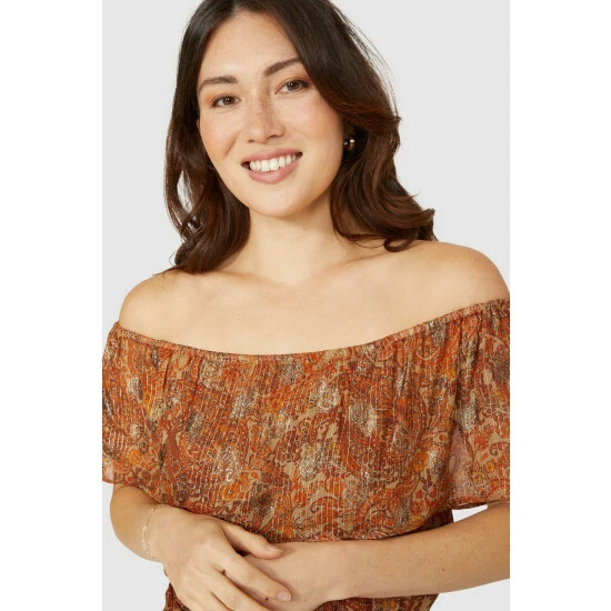 Metallic floral paisley bardot maxi dress from Mantaray . This dress will surely make you stand out from the crowd. In a stunning paisley print, this dress has been designed to be worn across the shoulders and features a tiered layer across the chest and a self-tie fabric belt.