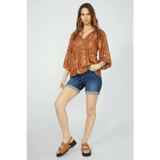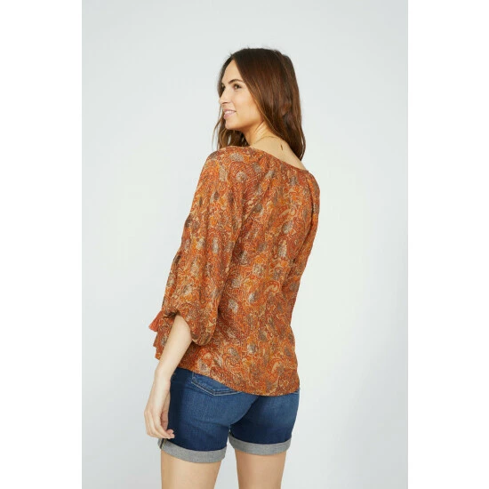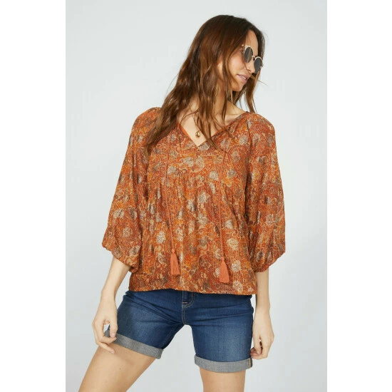 Metallic paisley print tie neck top from Mantaray. Designed in a true bohemian spirit, this top features a stunning mix of prints with metallic paisleys, a self-tie tassel neck and 3/4 sleeves with elasticated hems.