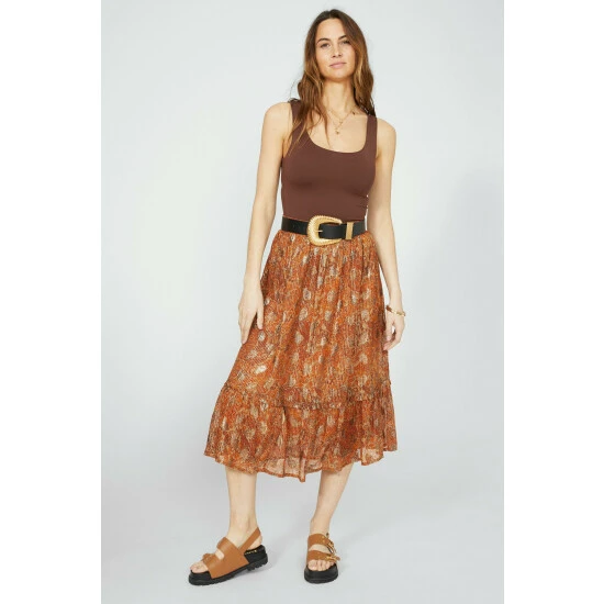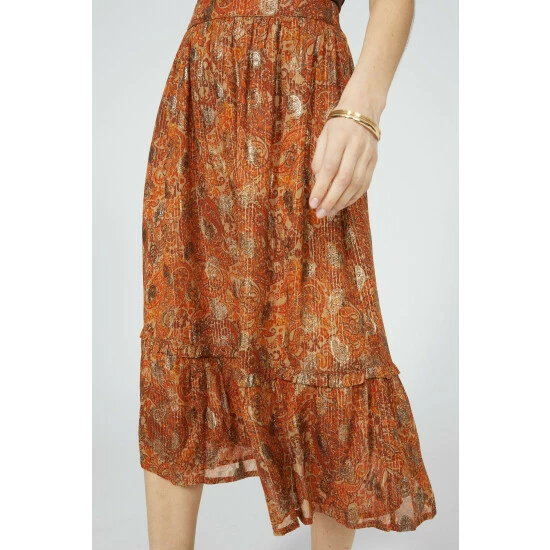 Metallic paisley print tiered midi skirt from Mantaray. Designed in a true bohemian spirit and crafted from a lightweight fabric, this midi skirt features a stunning mix of prints with metallic paisleys and a tiered hem. Pair with a cotton vest and sandals for a stylish boho look.