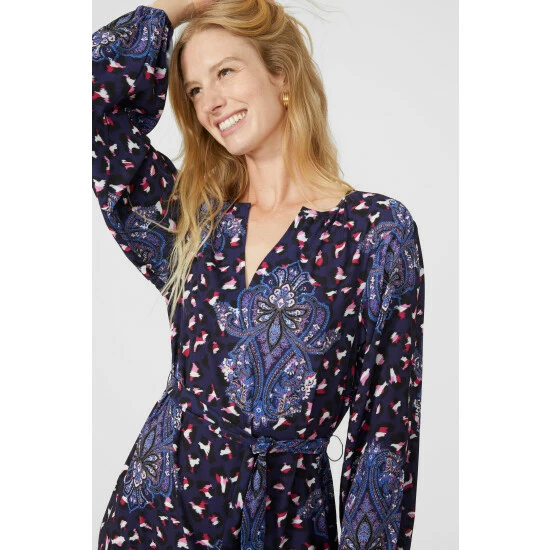 Mix & Match Animal Printed Puff Sleeve Dress from Mantaray. Update your dress collection with bold designs crafted from luxe fabrics and look to this must-have printed puff sleeve dress. Boasting long puff-style sleeves, a modest cut V neckline, a self-tie belt to cinch the waist and a beautiful print dress finish. Crafted from 100% Polyester. Wash at 30. Model wears a Size 10.