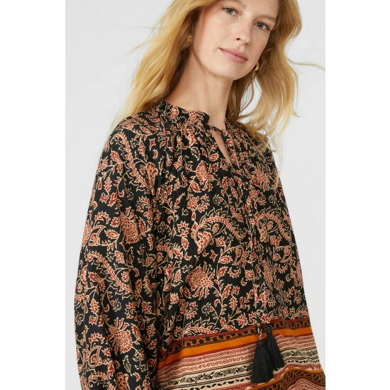 Paisley Border Print Blouse from Mantaray. Vibrant in print and luxe in texture and fabric, opt for this fashion-approved women’s blouse top. Boasting long sleeves with elasticated cuffs, a drawstring front with tassel embellishments, and a chic paisley border print finish. Style with tailored trousers, smart shoes, and gold accessories. Made from 100% Viscose. Wash at 30. Model wears a Size 10.