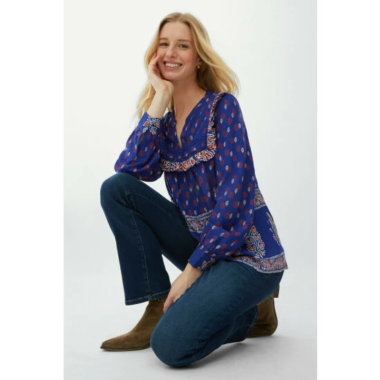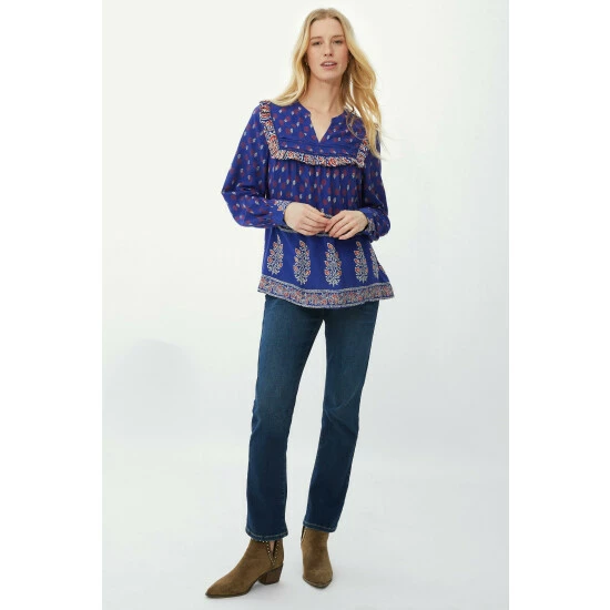 Paisley print top from Mantaray. Designed in a true bohemian spirit, this notch neck top exudes nonchalance in the most stylish way possible. Adorned with a paisley print and frilled trims, this relaxed-fit style can be worn with denim or corduroy depending of the weather.