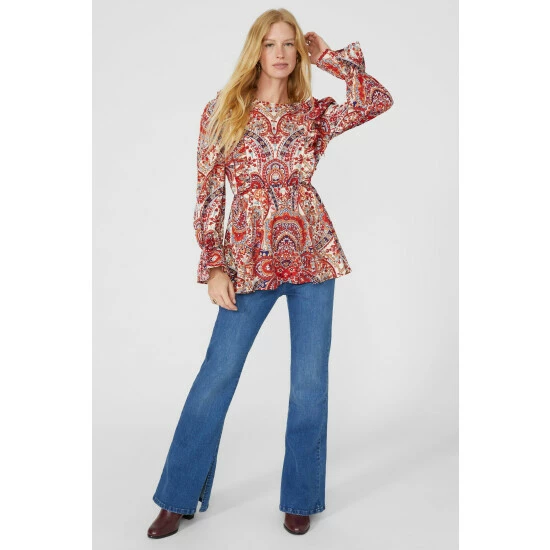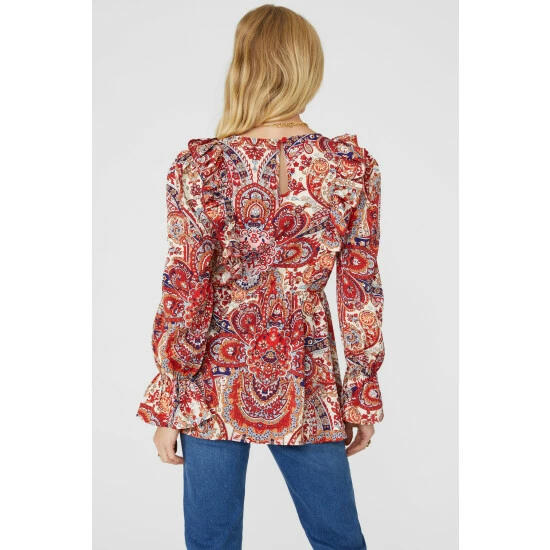 Paisley Printed Frill Detail Top from Mantaray. Add chic top designs made from comfortable, lightweight fabrics into your seasonal wardrobe and opt for this style-approved women’s frill detail top. Boasting long puff-style sleeves, shoulder frill detailing, and an all-over paisley print finish. Team with flared-cut jeans, leather heels and accessorise with a statement necklace. Crafted from 100% Polyester. Wash at 30. Model wears a Size 10.