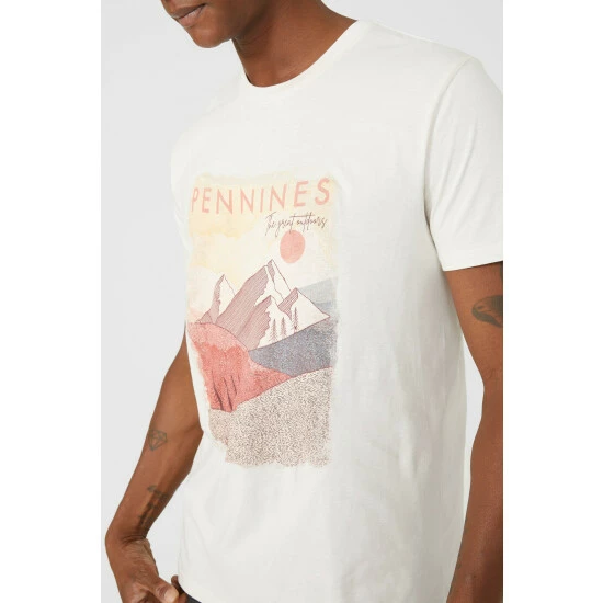 Pennines Printed Tee from Mantaray. Refresh your casual wear collection with eye-catching menswear styles and select this stylish printed tee. Featuring short-cut sleeves, a circular neckline, a graphic logo print and a tailored cut finish for the optimal fit. Match with comfy jeans and style with classic trainers. Crafted from 100% Cotton. Wash at 30. Model wears a Size M.