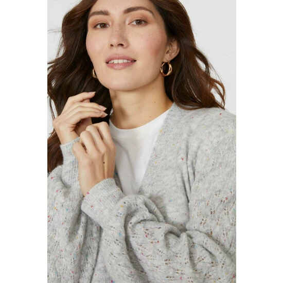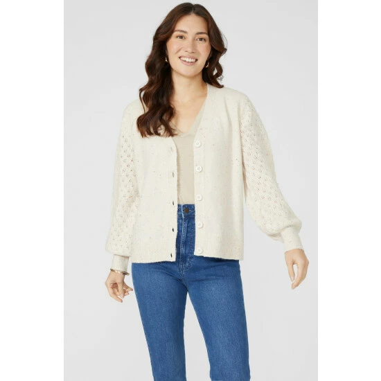Pointelle Stitch Nep V Neck Cardigan from Mantaray. Modify your knitwear collection with contemporary womenswear styles and select this pointelle stitch cardigan. Boasting long soft sleeves with stretch cuffs, front button detailing and a beautifully tailored cut finish for the ultimate fit. Made from 51% Polyester, 46% Acrylic, 3% Elastane. Wash at 30. Model wears a Size 10.