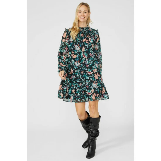 Printed High Neck Tunic Dress from Mantaray. Feminine in aesthetic and crafted from luxe fabrics, elevate your style, and opt for this high neck tunic dress for women. Boasting long sleeves with frill cuffs, a high cut neckline, shoulder frill detailing, and all-over floral print finish. Coordinate with leather knee-high boots.