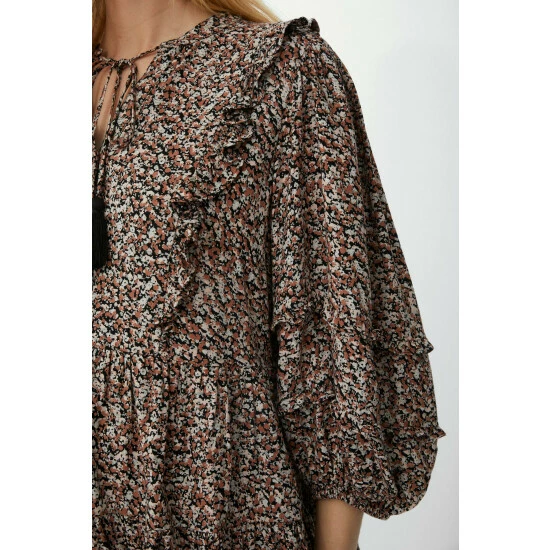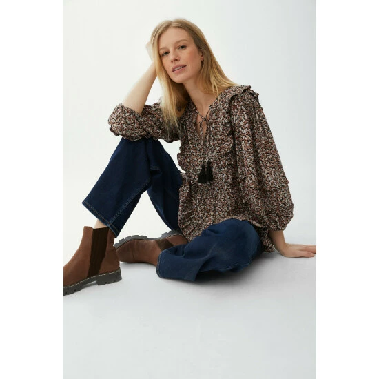 Ruffle Detail Ditsy Print Square Neck Top from Mantaray. Opt for understated styling and update your look with casualwear aesthetics such as this versatile women’s top. Featuring a feminine, top ruffle embellishment, a tassel tie front, comfortable balloon sleeves, front button detailing and comfortable top fit. Style with jeans and coordinate with statement boots. Made from 100% Viscose. Wash at 40. Model wears a size 10.