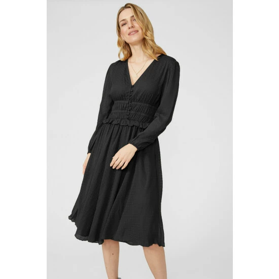 Shirred Waist Dobby Midi Dress from Mantaray. Dress the part this season and beyond and elevate your style with this flattering women’s midi dress. Featuring long soft sleeves with stretch cuffs, front button detailing and a tailored cut finish for a figure-flattering shape. Crafted from 100% Polyester. Wash at 30. Model wears a Size 10.