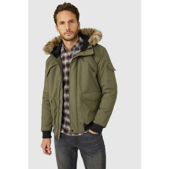 Mantaray Short Parka from Mantaray. Comfortably warm and made from weather-ready fabrics, look to this men’s Parka coat. Boasting long padded sleeves with stretch cuffs, a faux fur lined hood, pocket detailing, popper buttons and a zip-up front for optimal warmth.