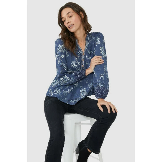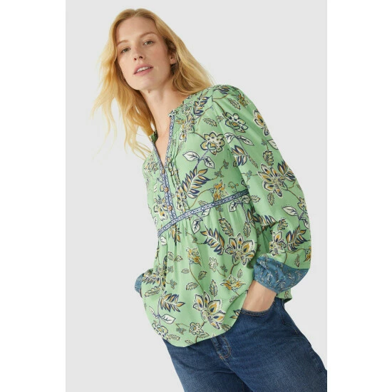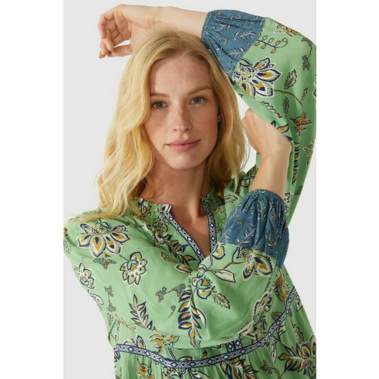Sketchy leaf mix & match tiered midi dress from Mantaray. This stunning style is the dress that keeps giving, as you can wear it so many ways and for so many occasions. In an eye-catching floral leaf print, with a clashing tiered hem on the midi-length skirt, this versatile frock has statement sleeves, a pretty shirred and frilled tie neck, a gathered waist and contrast button front fastening. You can dress this style up or down and wear all year long – just add a polo neck, tights and long boots for winter. Other colours also available.