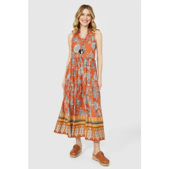 Sleeveless Floral Print Maxi Dress from Mantaray. Inject some bohemian styling into your clothing wardrobe this season with this iconic women’s maxi dress. Boasting comfortable sleeveless arms, a front tie with tassel detailing, a frill waistline that accentuates your curves and a flattering tailored cut finish. Style with a denim jacket and your favourite summer shoes. Crafted from 100% Viscose. Wash at 30. Model wears a size 10.