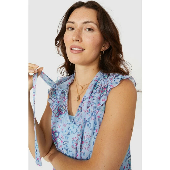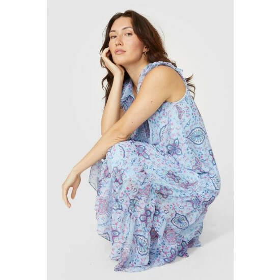 Sleeveless Frill Yoke Motif Print Dress
